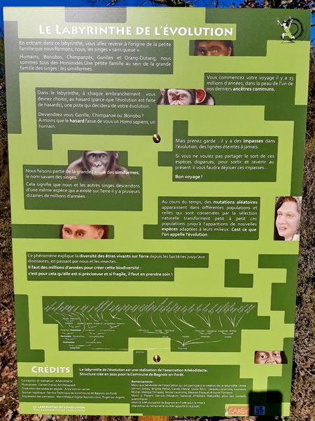 > Le labyrinthe de l’évolution, aménagé dans la végétation naturelle, vous propulse il y a 7 millions d’années en arrière, dans la peau de Pierolapithecus, un ancêtre que nous partageons avec plusieurs grands singes actuels.... Après avoir erré au hasard dans l’évolution ressortirez vous humain, gorille, chimpanzé ou bonobo ?