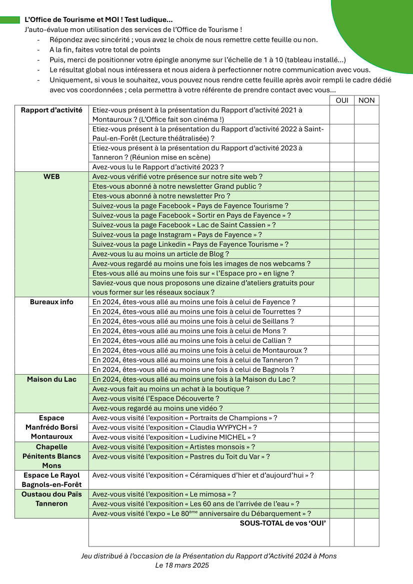 On vous invite à prendre part au « test ludique » que nous avons proposé. Auto-évaluer votre utilisation des services de l’Office de Tourisme en téléchargeant le questionnaire ci-dessous !