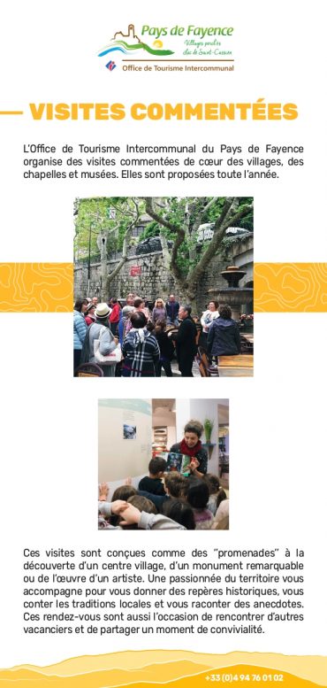 Découvrez l’histoire de Fayence, lors des Rondes Secrètes, visites nocturnes commentées, mêlant patrimoine et théâtre. Une visite immersive pour plonger, à la tombée de la nuit, au cœur du passé du village. Dates : les mardis 22, 29 juillet, 5 et 19 août Départs : 20h30, 20h50, 21h10 Lieu : Départ Place Léon Roux, devant l’Office de Tourisme Tarif : […]