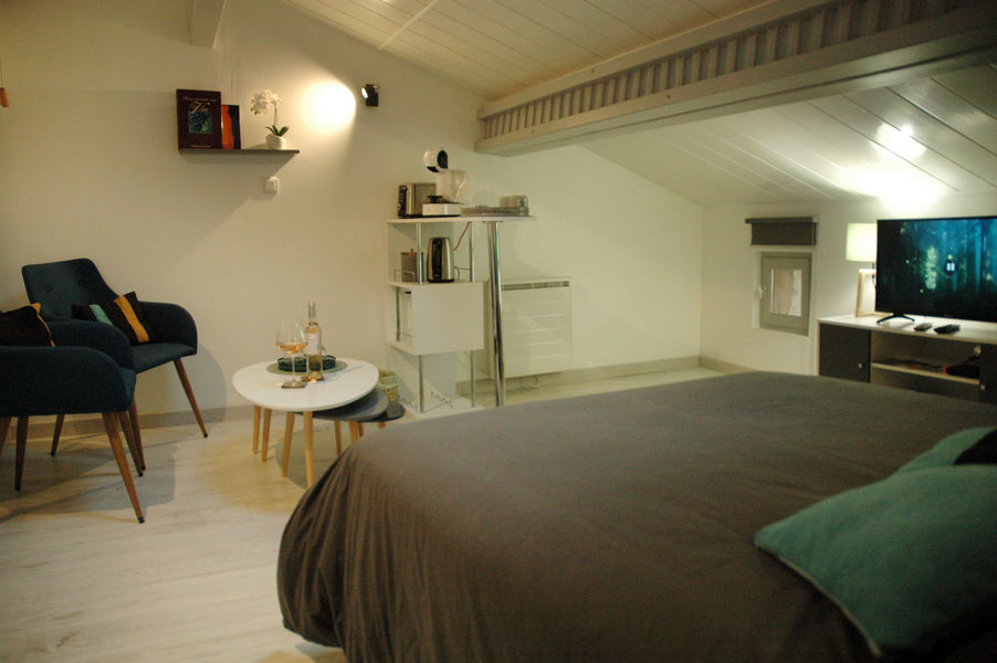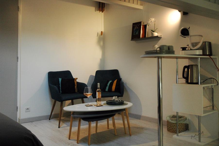 Dans l'espace détente, vous aurez à votre disposition l'équipement pour le petit-déjeuner : cafetière, micro-ondes, bouilloire, toaster et frigo type mini-bar.