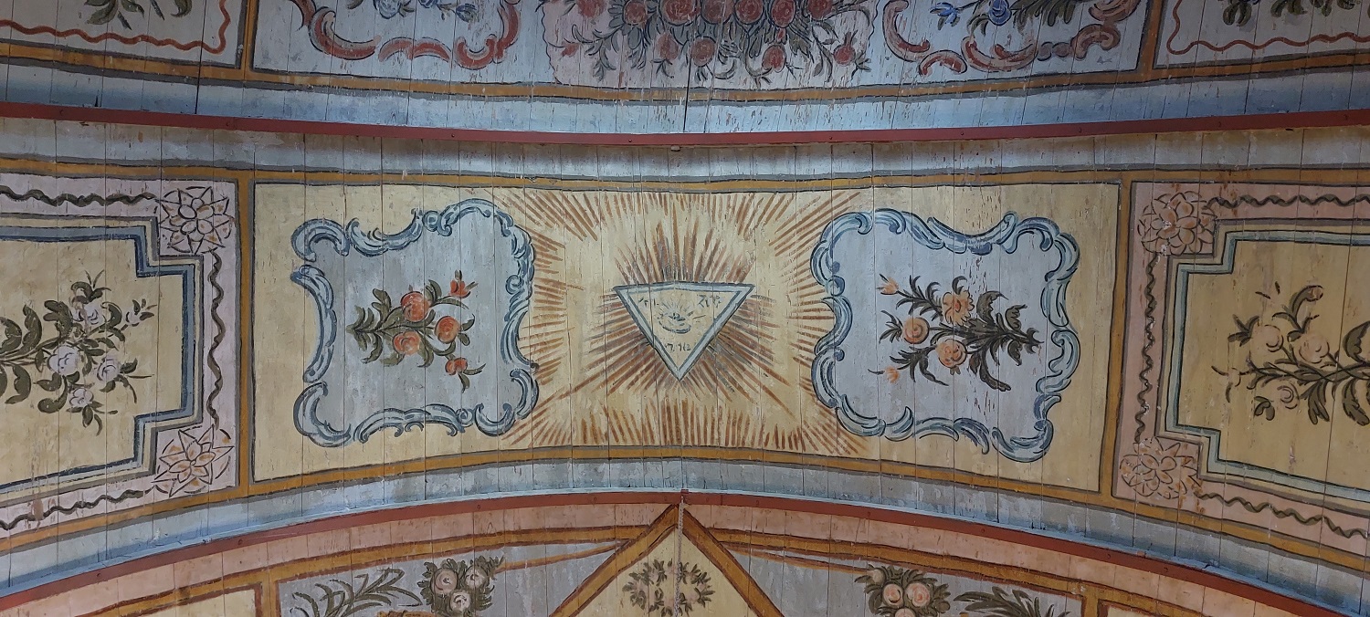 Le plafond et les murs sont totalement recouverts de bois peint. Les scènes religieuses alternent avec des bouquets de roses.