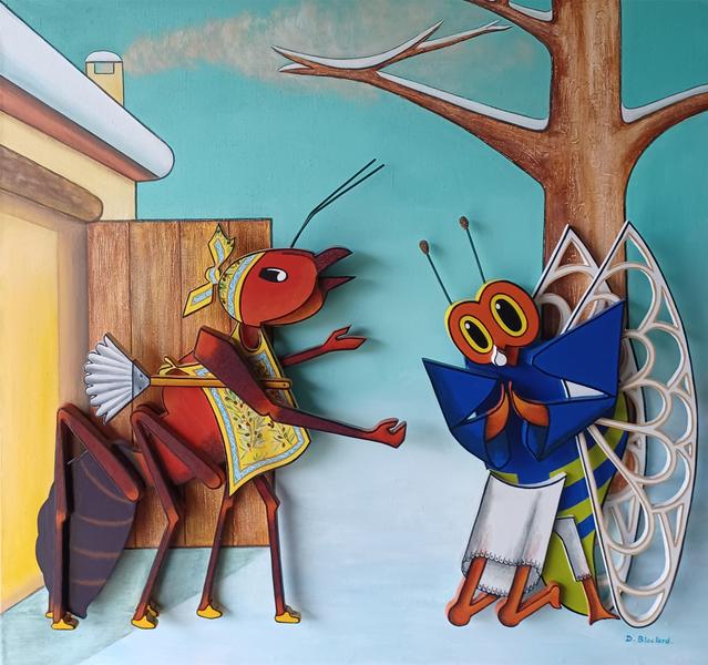 Sur bois de palettes, j’ai peint des musiciens de jazz et autres. Depuis plusieurs années, je travaille sur LES FABLES DE LA FONTAINE : “LE CORBEAU ET LE RENARD”, “LA CIGALE ET LA FOURMI”, “LE LIEVRE ET LA TORTUE”, etc,.. séries de peintures sur papier, sur toile, et quelques sculptures en bois peintes.