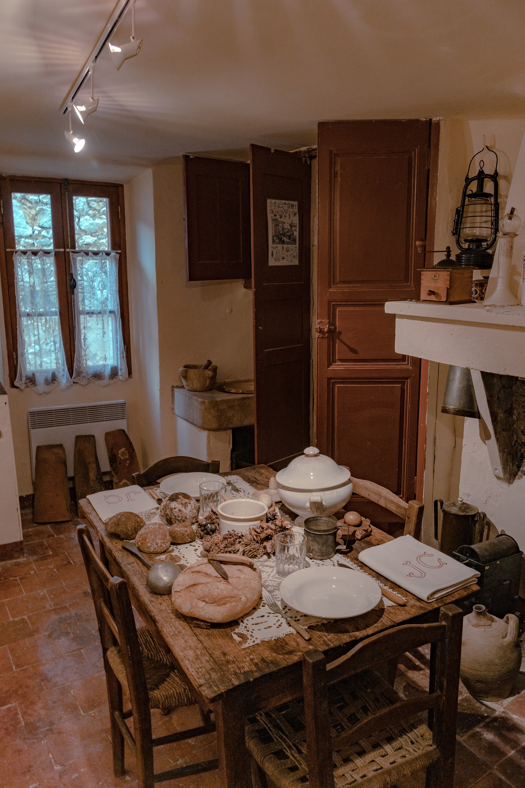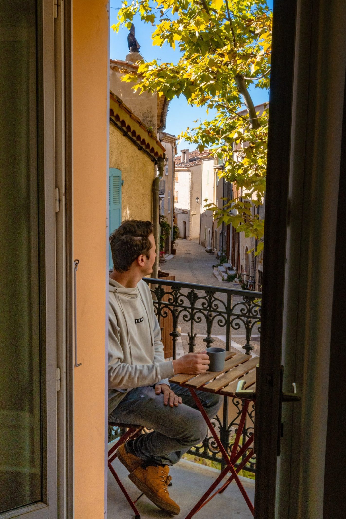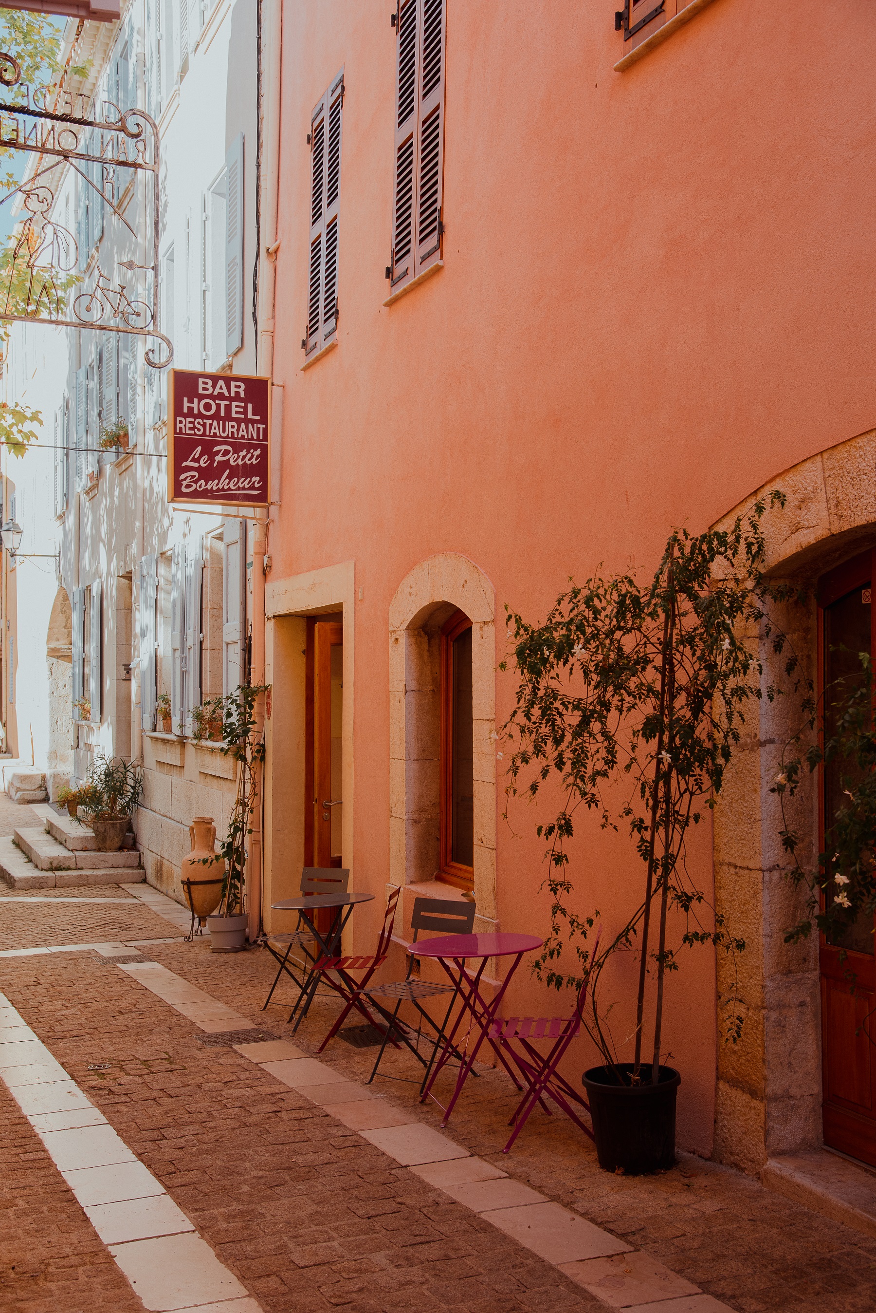 Après un survol de drone du village et des clichés des premiers rayons de soleil, notre estomac crie famine. Direction la salle voûtée du restaurant « Le Petit Bonheur » pour un petit déjeuner copieux et frais, accompagné des viennoiseries renommées de la boulangerie du village.