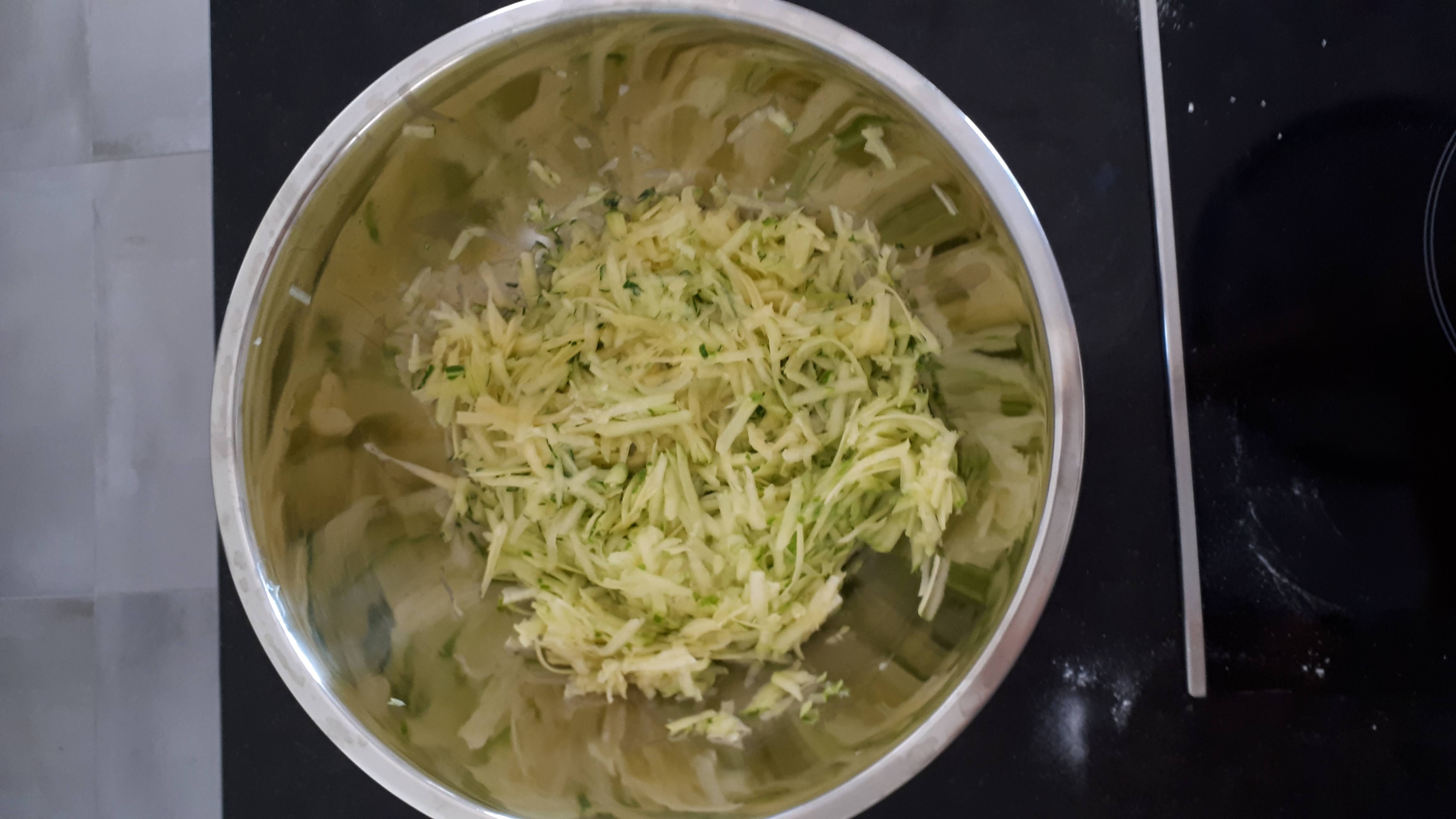 Commencer par préparer la courgette. La laver. Couper les extrémités. L’éplucher ou non au choix. Puis la râper. Réserver.