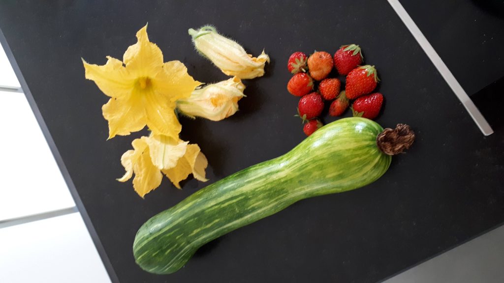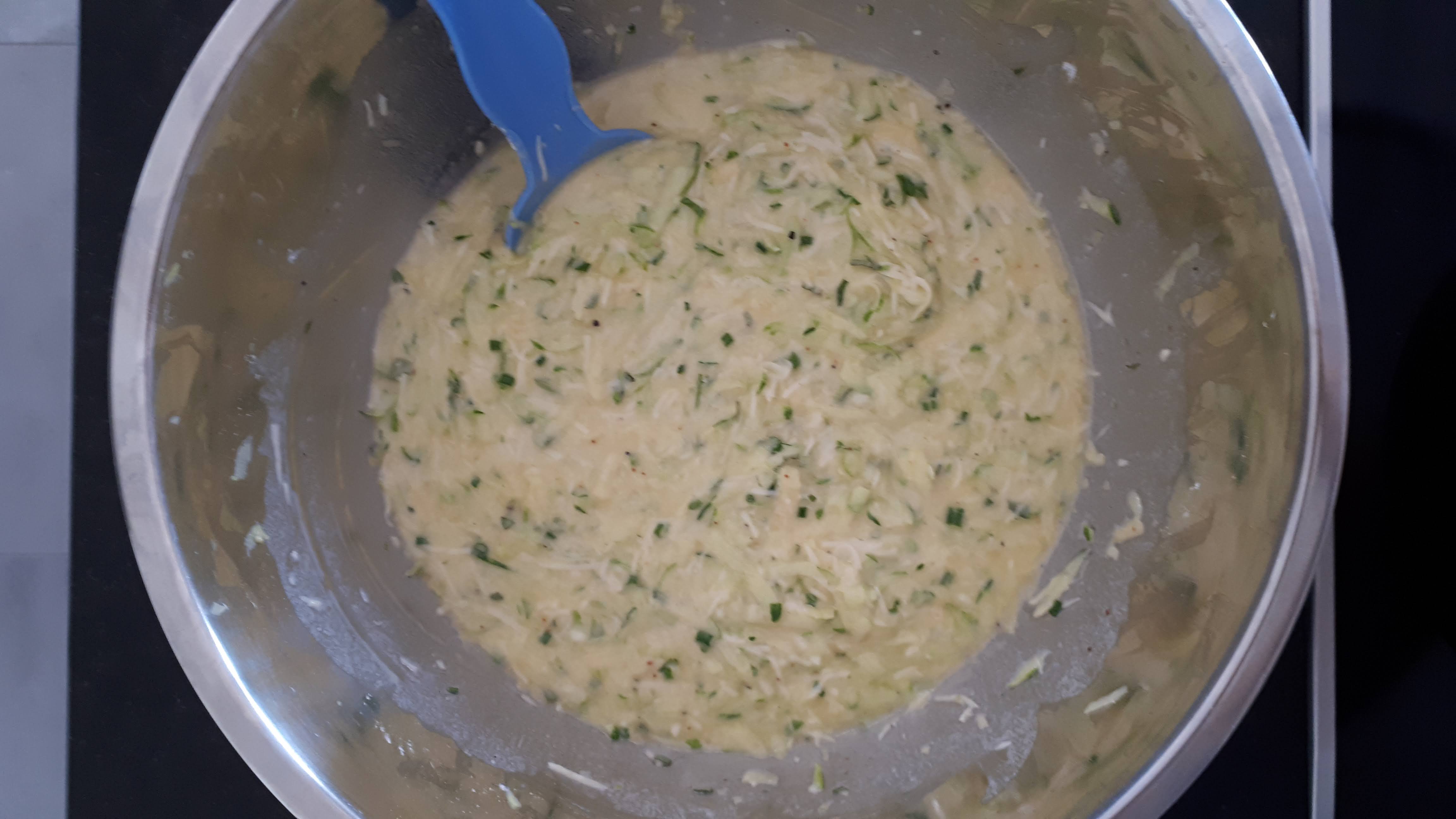 3. Mettre la courgette râpée essorée dans un grand saladier. Y ajouter les herbes fraiches ciselées, une pincée de sel, de poivre et le piment d’Espelette. Mélanger le tout.