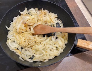 - Faire revenir les oignons dans une poêle avec un filet d’huile d’olive à feu doux ( de manière à les faire dorer et non brunir).