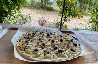 - 1 pate à pizza (que j’avais préalablement commandé chez mon Boulanger) ; 4 gros oignons ; quelques anchois et olives niçoises ; et bien sur un filet d’huile d’olive.