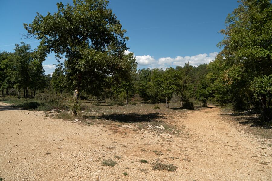 La pente et le revêtement s’adoucissent jusqu’à une courte descente rocailleuse. Le circuit se dirige ensuite vers une large piste DFCI bien revêtue, puis oblique sur la droite vers un chemin de ballast (4) qui s’incline gentiment jusqu’au site des chênes centenaires du Défens.