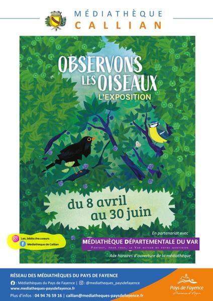 Exposition Observons les oiseaux, en partenariat avec la Médiathèque départementale du Var, aux horaires d'ouverture de la Médiathèque.