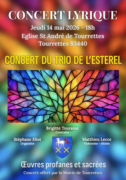 Le Trio de l'Estérel avec les musiciens :Brigitte Touraine Contralto– Matthieu Lecce Violon et Alto – Stéphane Eliot Orgue vous propose un concert lyrique avec des oeuvres sacrées et profanes en l'église St André de Tourrettes. Offert par la Municipalité.