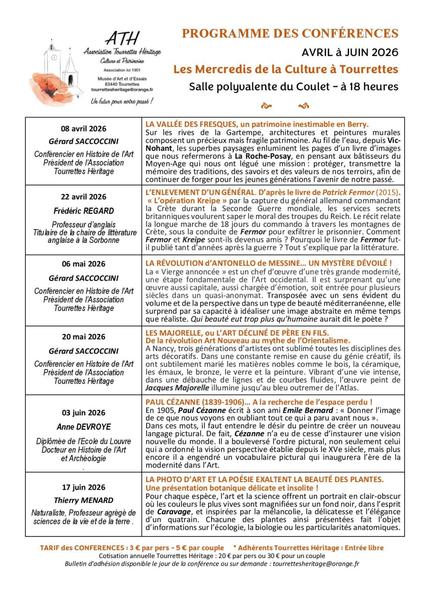 Bulletin d'adhésion disponible le jour de la conférence ou sur demande : tourrettesheritage@orange.fr.