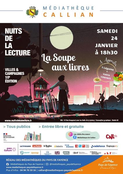 Dans le cadre de la Nuit de la Lecture, la Médiathèque de Callian vous invite à partager un moment convivial autour d'une soupe de légumes cuisinée sur place,