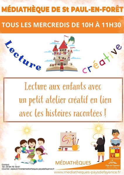 Lecture aux enfants de plus de 3 ans sur une thématique choisie avec un petit atelier créatif.