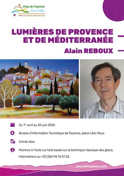 Venez vivre un moment privilégié en rencontrant un artiste peintre de Fayence, Alain Reboux, qui vous présentera son exposition Lumières de Provence et de Méditerranée.