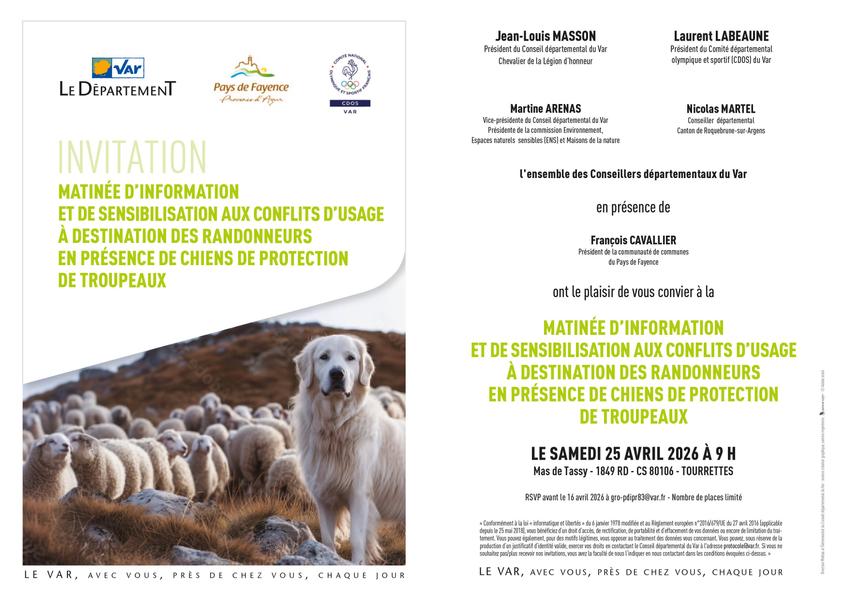 Le Comité olympique et sportif du Var et la Communauté de communes du Pays de Fayence vous proposent une matinée d'information et de sensibilisation aux conflits d'usage en présence de chiens de protection de troupeaux.