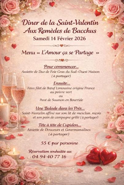 Le menu de la Saint Valentin au restaurant les Remèdes de Bacchus à Bagnols-en-Forêt: