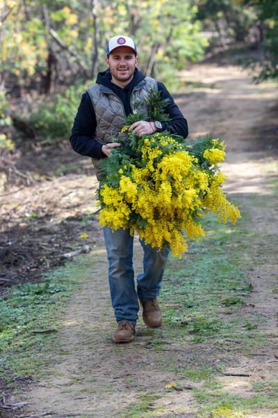FranceEucaMimosa produit de l'eucalyptus et du mimosa sur les collines de Tanneron depuis deux générations. Après une randonnée d’approche, Jean-Baptiste, mimosiste,