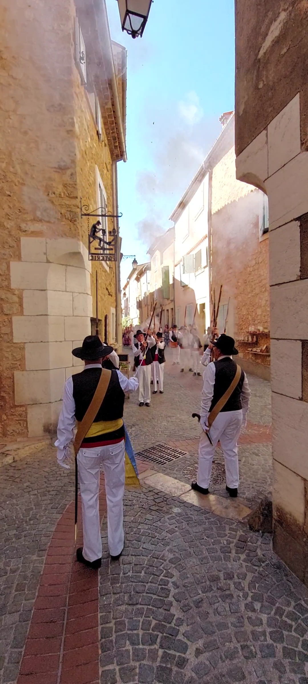 Gaby et Florence, Bravadeurs du Pays de Fayence. Gaby est Président des Bravadeurs du Pays de Fayence. Cette association existe depuis 16 ans et compte une trentaine de personnes dont 22 fusils.