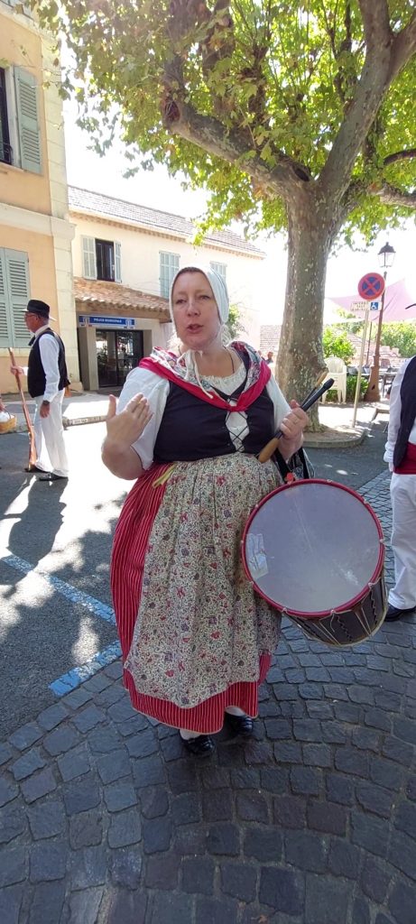 De leur côté, les femmes, en fonction de leur statut social dans le passé, portaient 3 différentes tenues : la Paysanne, l’Artisane et la Bastidane. Florence est revêtue de la Paysanne : corsage blanc, corset, jupe rayée, coiffe simple (on ne devait pas montrer ses cheveux), fichu et tablier.