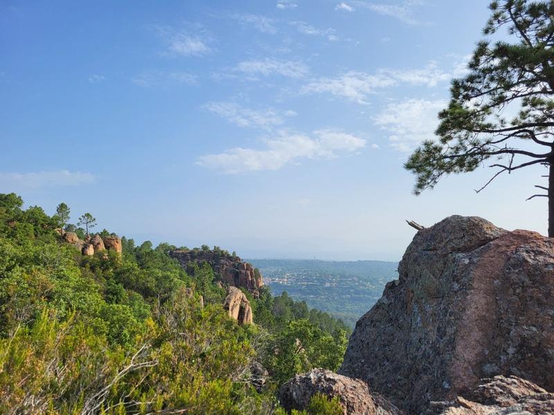 Apprécier la vue, au sud, sur la mer et la plaine de l'Argens et au nord sur le village et les montagnes du Haut-Var. Vous découvrirez tout d'abord une taillerie de meules dont certaines sont encore en place. Vous pourrez voir également les emplacements qu'elles ont laissés dans les roches. Ce site a été habité depuis l'époque du bronze. L'oppidum se trouve un peu plus loin. Tout au long de ce sentier vous marcherez au milieu des pins, certains tordus bizarrement, et des bruyères.