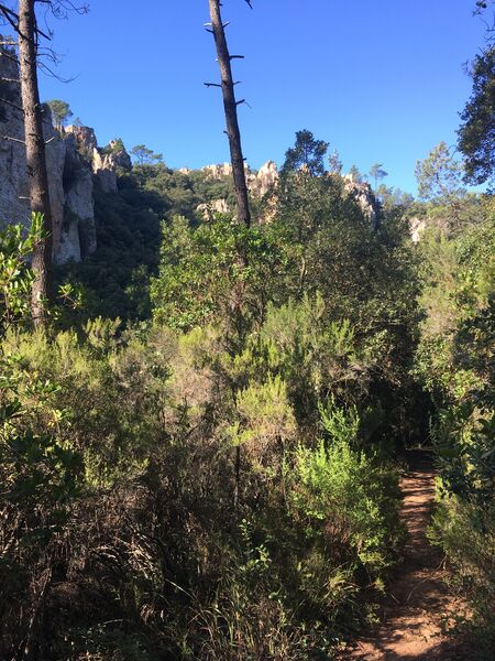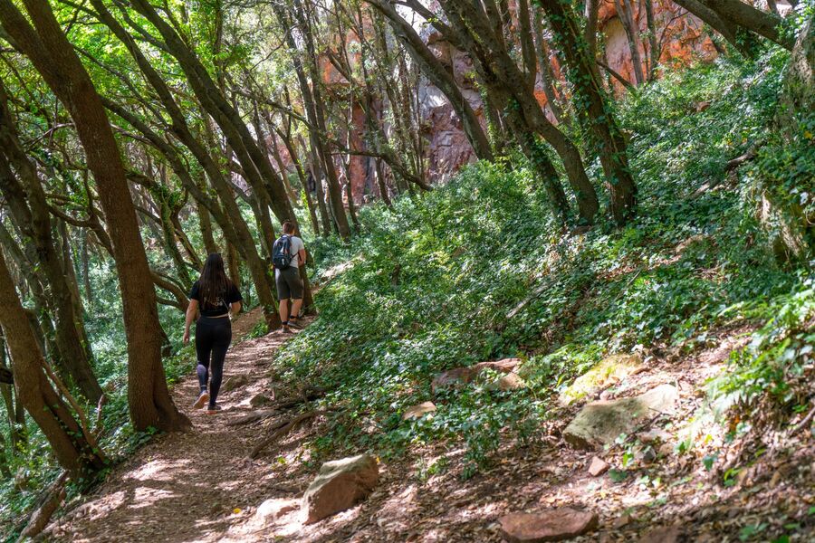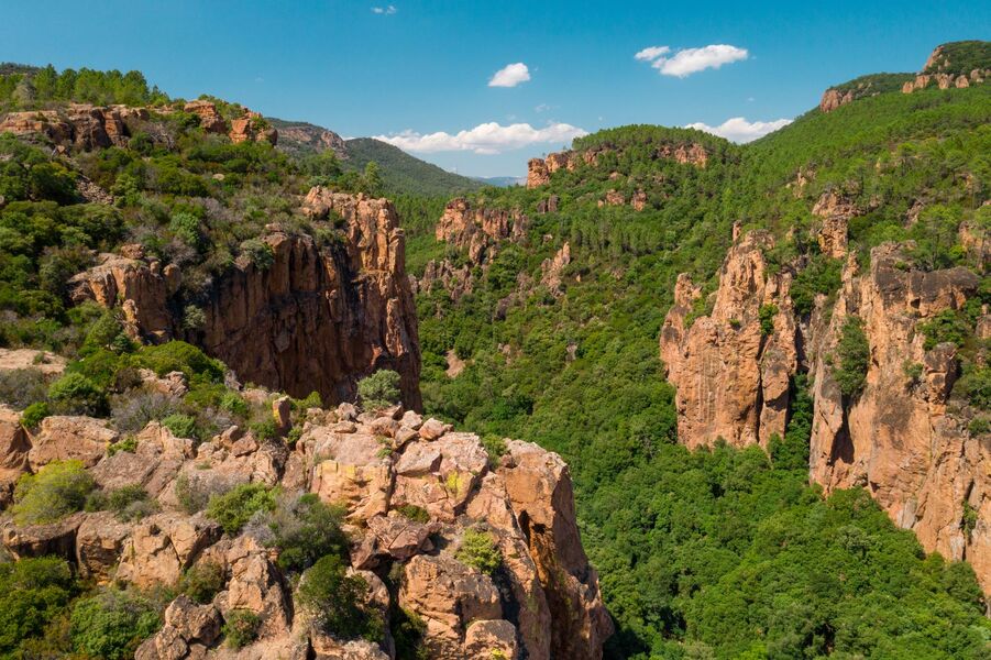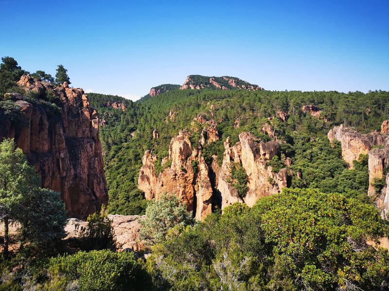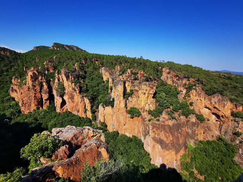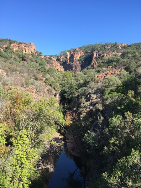 Creusées dans des roches volcaniques de couleur rouge, les gorges offrent de belles curiosités géologiques comme la grotte de Muéron, un des sites d'escalade majeurs du Var au coeur de cette randonnée.