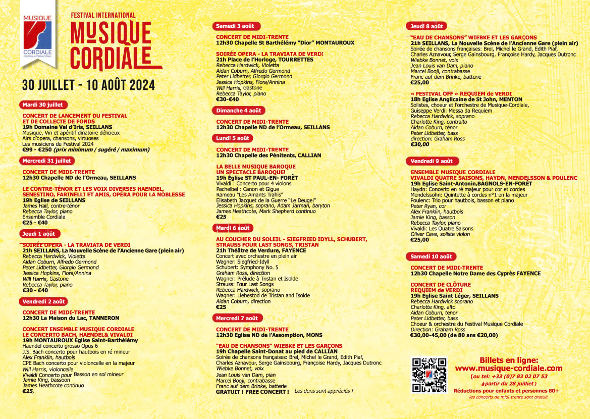 17 événements variés : orchestre, musique de chambre, récitals, opéra, chorale, jazz, chant, folk et un peu de rock nostalgique auront lieu dans différents lieux et dans plusieurs communes du Pays de Fayence. Détails, date par date, sous ce visuel.