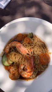 En arrivant, j’ai tout de suite été impatient de manger dans un cadre pareil, il faut dire le Ponton est très bien situé, en face du lac de Saint-Cassien avec une vue en hauteur sur l’eau. J’ai très bien été accueilli et pour le coût il m’a fallu du temps pour faire mon choix. La carte est variée ainsi qu’évolutive. Mon choix s’est porté vers un wok de gambas. Le repas était très bon et pour ce qui est du dessert, il ne m’a pas fallu autant de temps pour me décider, étant un grand fan de tiramisu. Je n’ai pas été non plus déçu par la pâtisserie italienne qui m’a donné envie de saluer le chef.