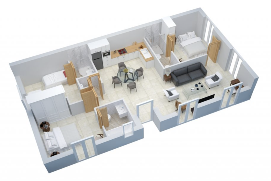 - LUXE & CALME : Intérieur moderne de 80m² et aménagé avec goût. Le salon possède des chaises longues, un canapé ainsi qu’un coin bureau pour travailler en toute tranquillité.