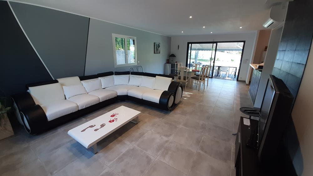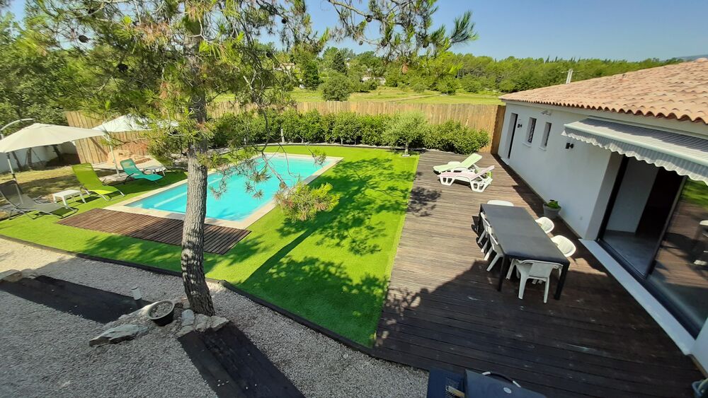Villa récente climatisée de plain-pied facile à vivre avec son accès direct à la piscine, équipée pour 8 personnes, sur terrain clôturé de 2000 m² avec portail électrique, portillon, parking et double garage à l’intérieur de la propriété sans vis-à-vis à la campagne à 3 km des commodités et non occupée par les propriétaires.