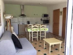 Gîte mitoyen de plain-pied exposés plein sud, donnant sur une grande terrasse et d’une cour privative de 50 m², salon de jardin, transats, barbecue électrique. Cuisine ouverte sur séjour/salon avec canapé convertible en 140 cm, une salle d’eau avec WC, une chambre avec 1 lit 2 pers en 160 cm (modulable en 2 lits 1 pers)