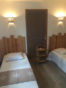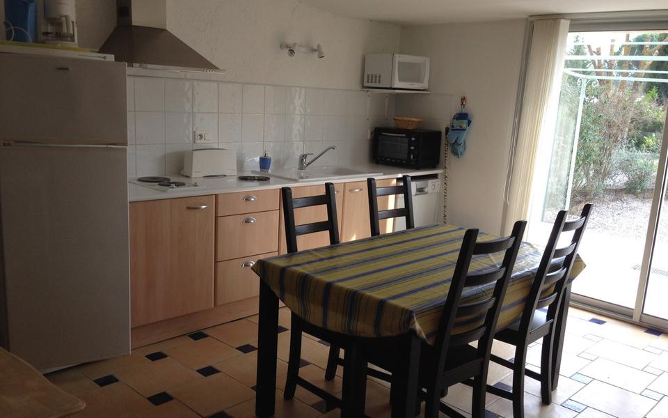 Gîte mitoyen de plain-pied exposés plein sud, donnant sur une grande terrasse et d’une cour privative de 50 m², salon de jardin, transats, barbecue électrique. Cuisine ouverte sur séjour/salon avec canapé, une salle d’eau avec WC, une chambre avec 1 lit 2 pers en 160 cm (modulable en 2 lits 1 pers) communiquant à la 2e chambre avec 2 lits en 80 cm et WC/lavabo.