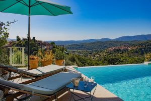 Luxueuse villa de 150 m² pour 6 personnes, avec piscine privative à débordement, vue panoramique à 180° sur Montauroux, Callian, et Mons et trois terrasses.