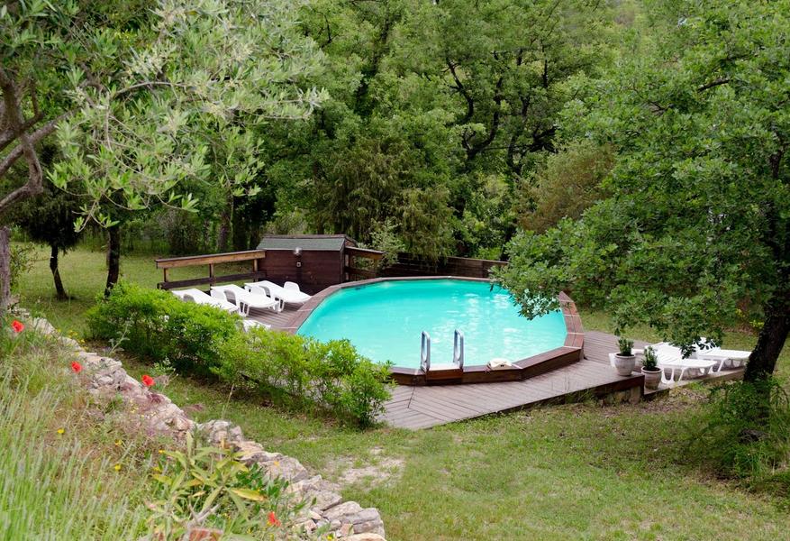 Cuisine d'été (barbecue, feu gaz, four à pain) avec terrasse de 30m² couverte et reliant la maison principale à l'annexe. Piscine (8x4x1.20) plage bois, alarme, située en contrebas de la berge devant maison. Local extérieur avec douche, lavabo et lave-linge.