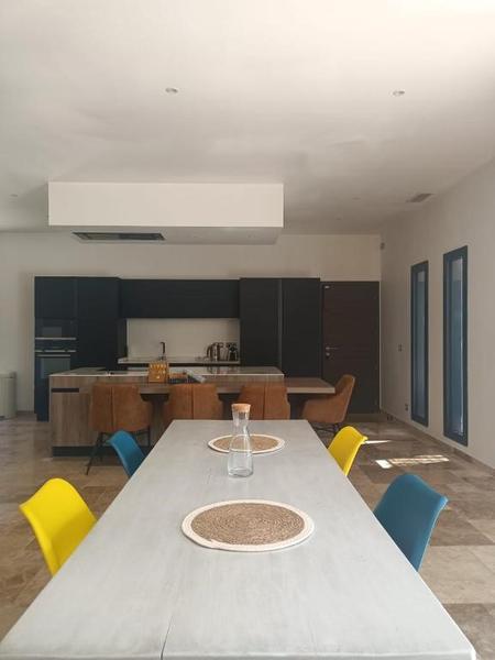 La terrasse de 200 m² offre une piscine chauffée et à la fois un pool house et une cuisine d'été avec four à pizzas pour se détendre et profiter des cigales et des oiseaux.
