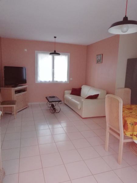 Maison de 3 pièces de 60 m² pour six couchages composée d'un séjour avec canapé convertible et télévision, salle à manger avec cuisine US, entièrement équipée (four, plaque induction, hotte, micro-onde, réfrigérateur congélateur, lave-vaisselle, lave-linge, cafetière, bouilloire, grille-pain, vaisselles et plancha électrique).