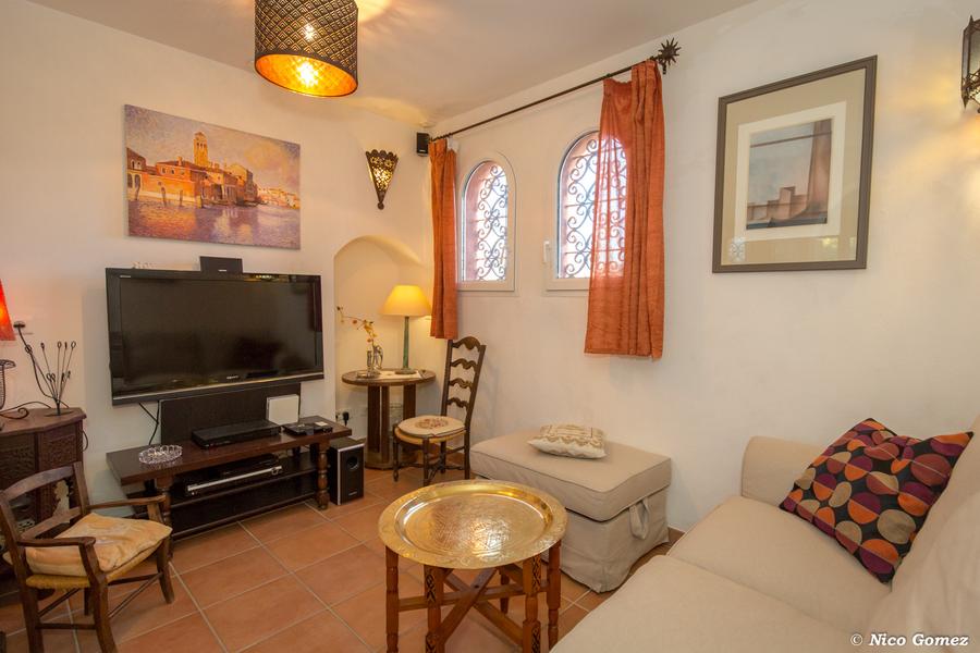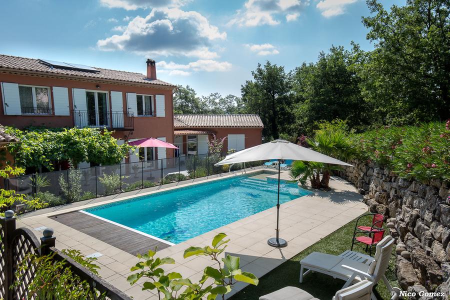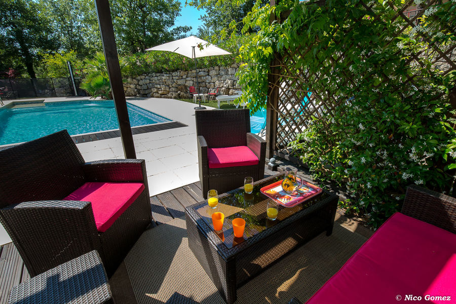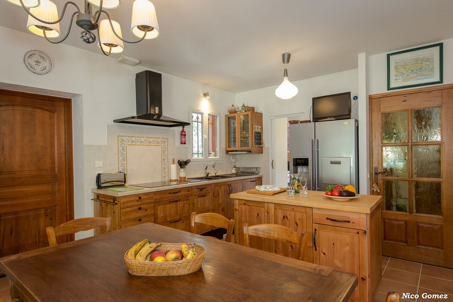 Villa pour huit personnes avec piscine privée, sécurisée, plage aménagée, terrasses et cuisine d'été, jardin clos, portail électrique, séjour et cuisine semi-ouverte, salon, TV.