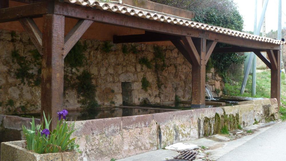 Immense lavoir, adossé à un mur en pierre de taille qui jouit d’une source vigoureuse venant de la nappe phréatique de la Rouvière, située juste au-dessus.