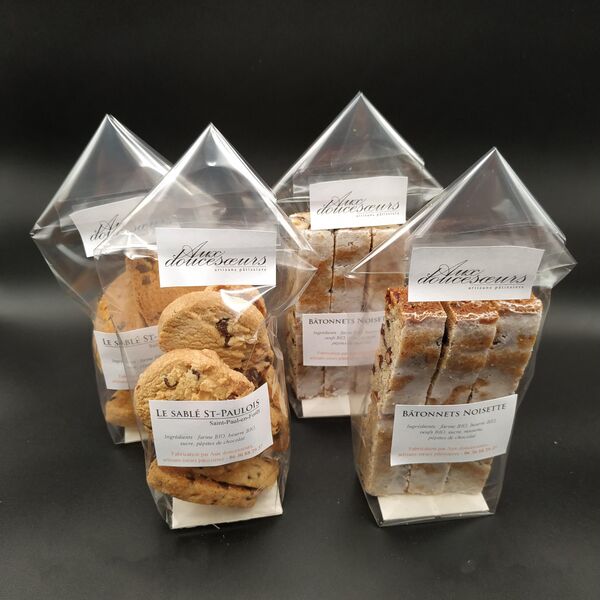 Auxdoucesoeurs réalise des biscuits et confiseries, tels que, sablés St Paulois, amaretti, biscuit citron etc.. ou encore Le Saint Cassien, biscuit à base de miel en vente à la Maison du Lac de St Cassien ; des guimauves et meringues.