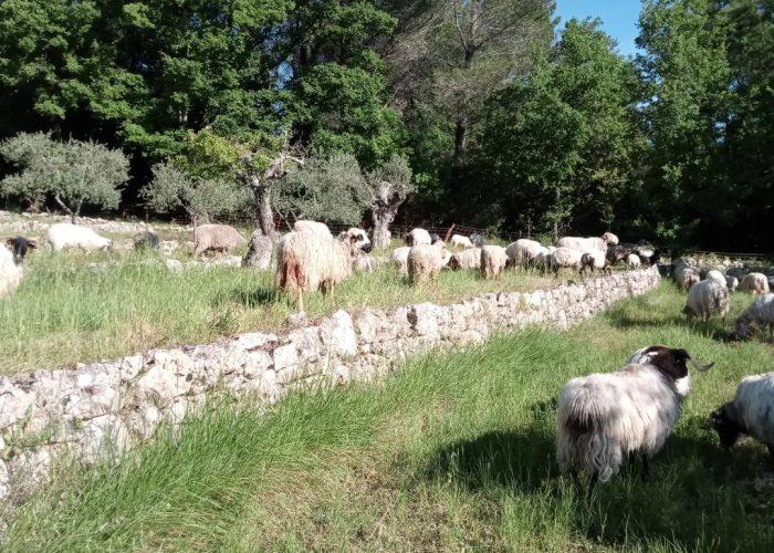 La conduite du troupeau : nous élevons 70 brebis en zone méditerranéennes, à partir de mars elles pâturent autour de la ferme des villards au milieu des oliviers et restanques verdoyantes, au printemps sur les parcours du massif de l'Esterel et l'été dans la réserve biologiques Fondurane au lac de st Cassien.