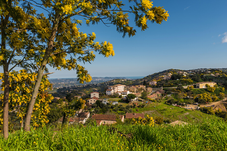 Accroché à des collines plantées de mimosas, fraisiers, de cultures florales, de bruyères, d’oliviers, de pins, de châtaigniers et de chênes lièges, la commune de Tanneron est formée de 22 hameaux, éparpillés sur son territoire.