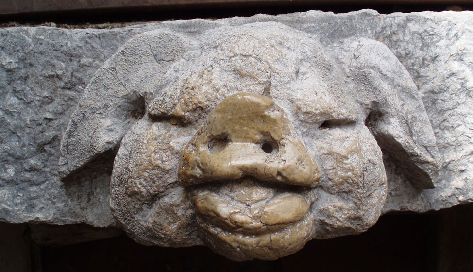Les Mascarons sont deux petites têtes situées à droite du porche de l’Hôtel de Ville. C’était une ancienne fontaine, le tuyau sortait de leur bouche.