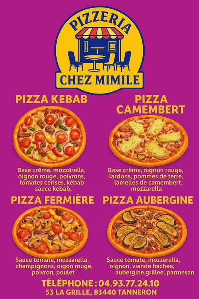 Au cœur de Tanneron, village emblématique de la culture du mimosa, le Food Truck Chez Mimile vous propose pizzas originales, pan bagnat, sandwichs américains et français, salades, boissons, à déguster en terrasse ou bien à emporter.