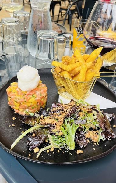 Tartare de saumon, Bavette à l'échalote et ses pommes de terre,