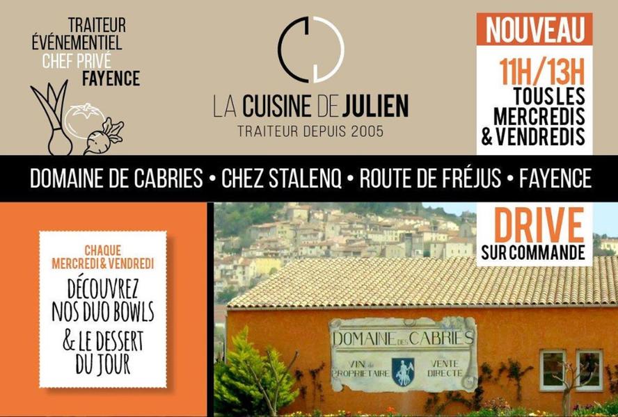 En Pays de Fayence,' La Cuisine de Julien ' Chef à domicile, et Traiteur évènementiel, propose des mets gourmands et raffinés sur commande, et aussi sur place au domaine viticole des Cabriès dans la campagne de Fayence, avec sa fameuse 'Bernadette'!