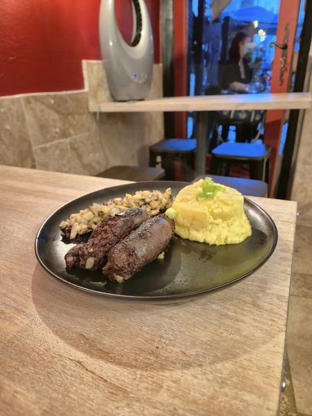 Poulet Marceau sauce curry -coco, Boudin noir aux pommes et sa purée,