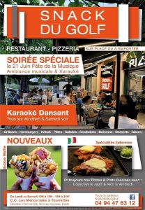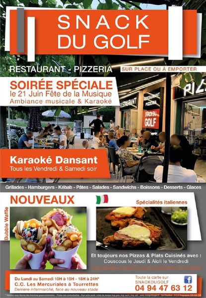 Situé au cœur de centre d'activités commerciales des Mercuriales, non loin du "village de caractère de Tourrettes", Le Snack du Golf vous propose les recettes classiques d'un véritable snack gourmand, servies en salle ou en terrasse.Le vendredi et samedi soir, c'est soirée "karaoké", ambiance garantie!