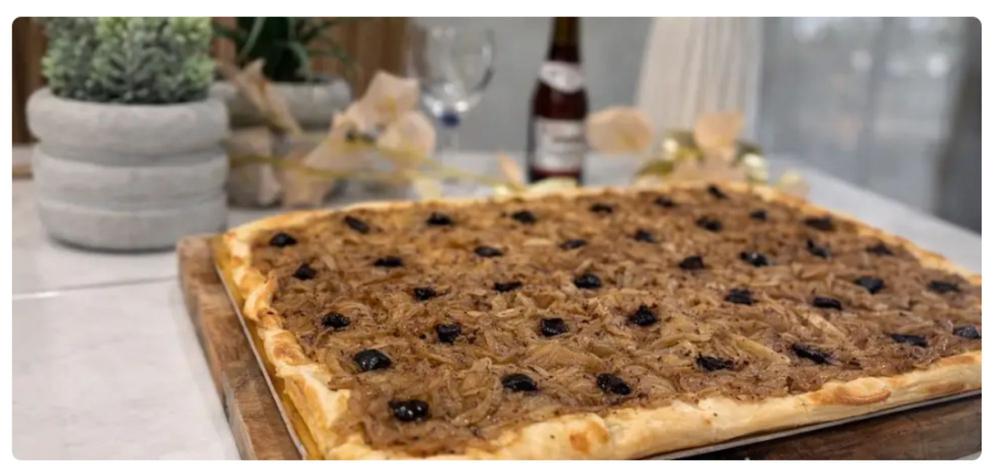 C’est une préparation à base de pâte à pain (plus épaisse qu’une pâte à pizza), d'oignons longuement confits, d' anchois, et de petites olives noires.